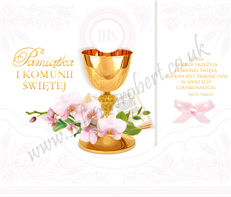 Książeczka z okazji I Komunii Św. (250 x 200 mm) z wybranymi tekstami liturgicznymi, kolorowe ilustracje. Ozdobne złocenia na okładce Ozdobna saszetka z brokatem